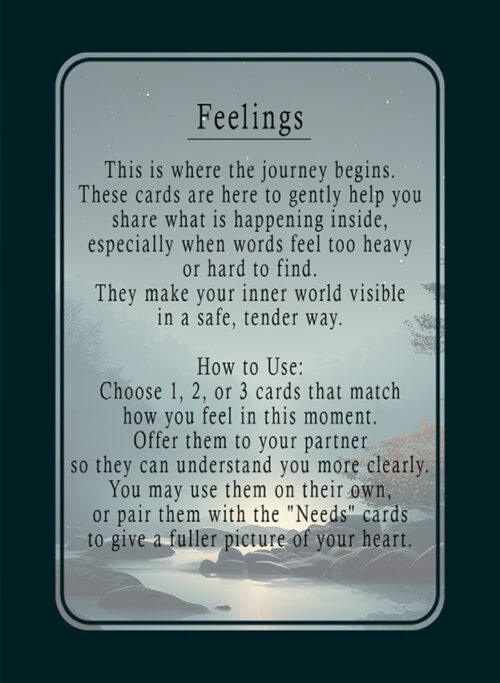 The Needs Deck helps you identify and communicate what you’re actually needing beneath your emotions – whether that’s emotional support, space, reassurance, or connection. These are often the things that go unspoken, yet drive most tension in relationships.
